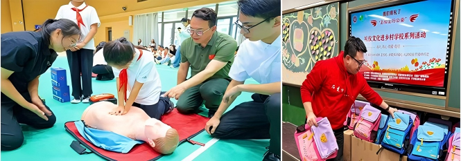 作为沈阳市团校少年国防教育(应急)学院院长,韩宏光把心外ICU“分秒必争”的急救素养融入国防教育课堂。为了让孩子们轻松掌握急救知识,他创新设计情景游戏,用模拟模型和AED设备搭建“急救小课堂”,还将复杂的操作流程编成朗朗上口的口诀;在东北育才中学,他把晦涩的应急医学知识转化为趣味十足的互动教学;在文艺二校,他不仅开展国防教育活动,分享自己参加九三阅兵的感悟,组织队列训练、战术演练,还手把手教孩子们心肺复苏、AED应用以及海姆立克法等应急技能。截至目前,他已向453名乡村儿童捐赠书包、急救手册等物资,让国防教育与应急知识真正走进孩子们的生活,在他们心中播下了爱国、担当的红色种子。