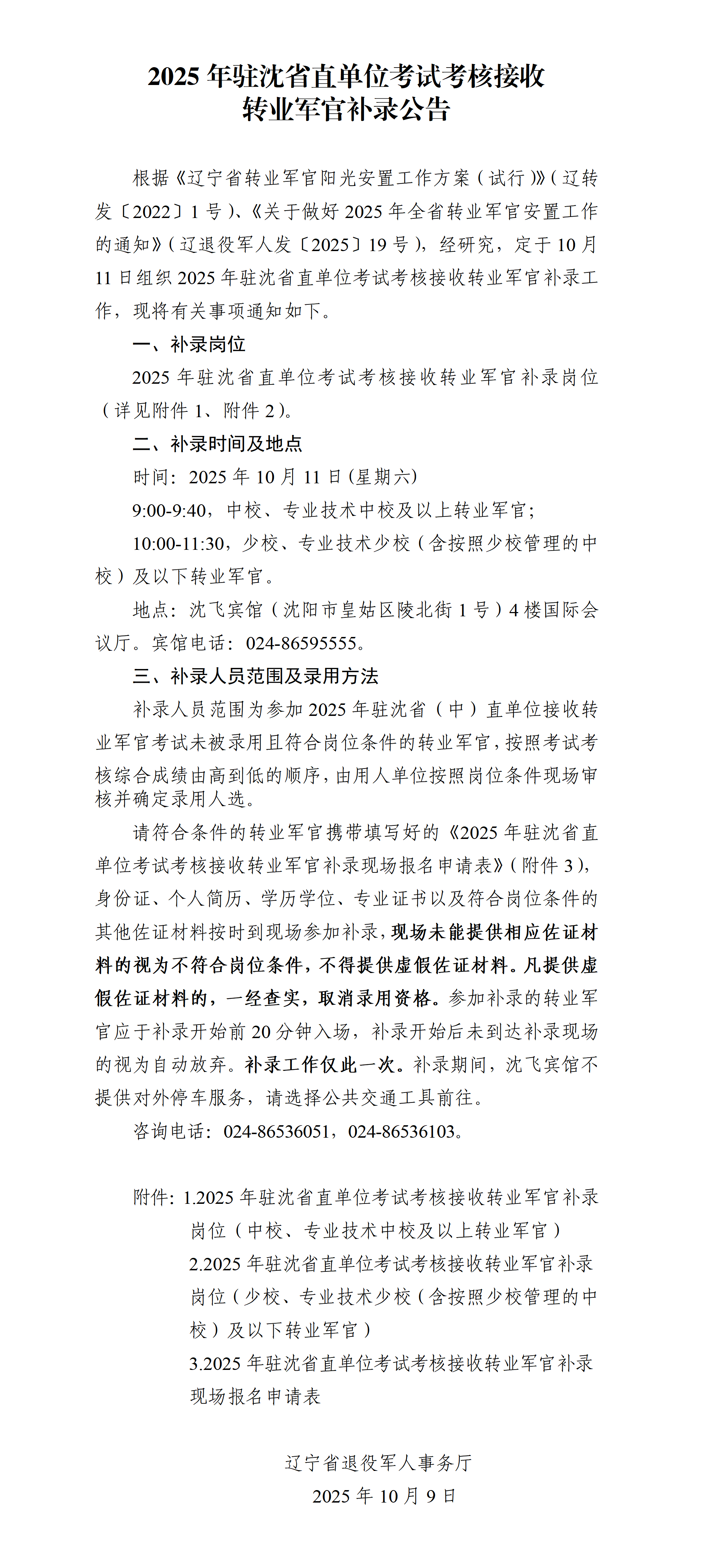 2025年驻沈省直单位考试考核接收转业军官补录公告